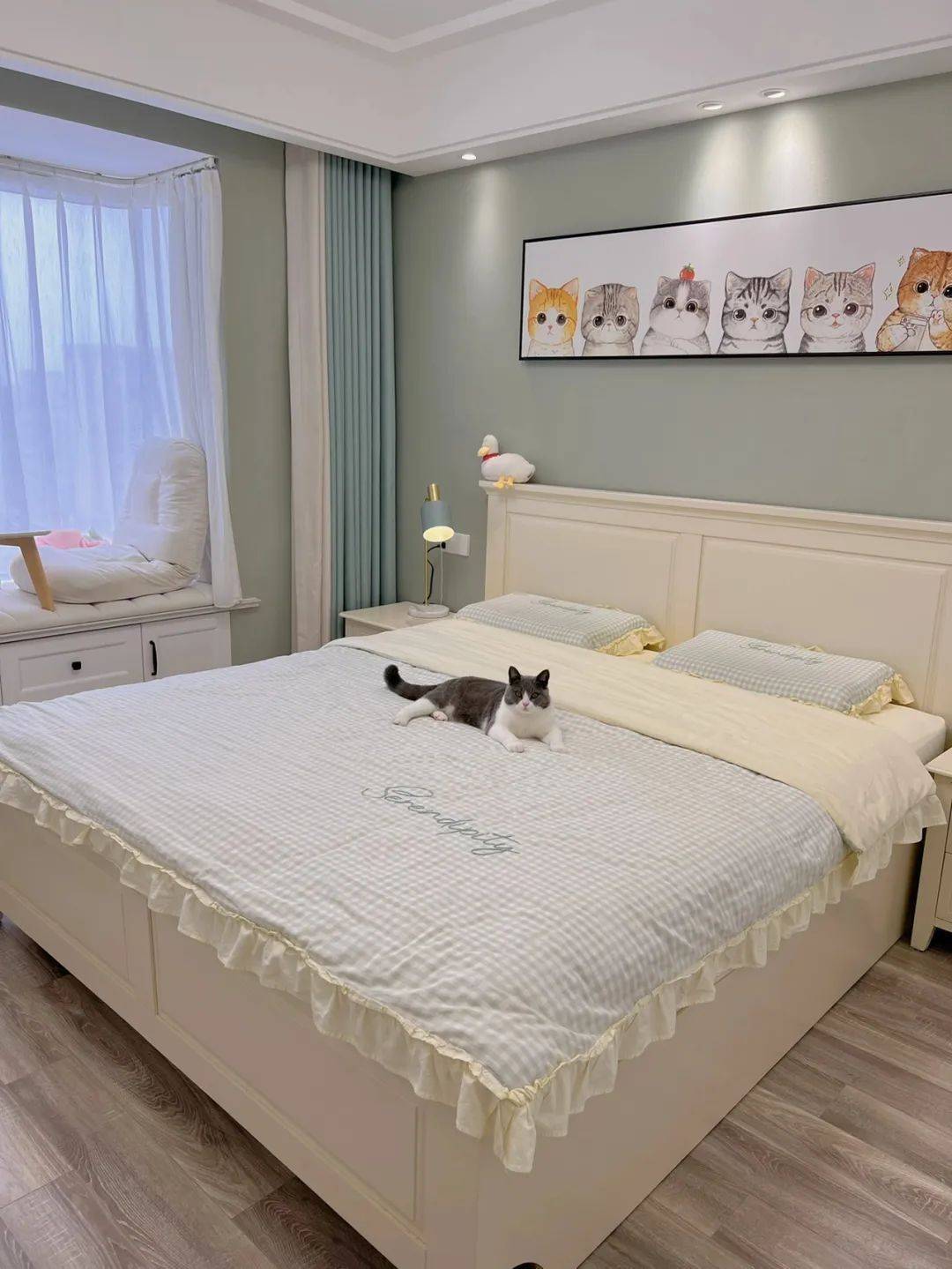 还有卧室,床头那盏小灯,灯光是暖黄色的,晚上开着特别有氛围感,配上简洁的床品,感觉一天的疲惫都能被治愈。
